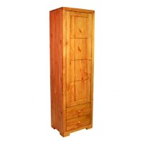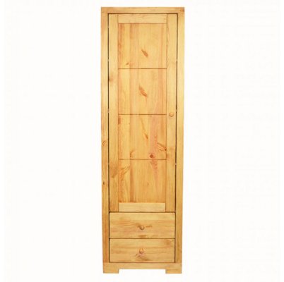 Этот однодверный шкаф имеет четыре полки за дверью. В нижней части витрины расположены два ящика с плавным механизмом выдвижения. Эта простая и удобная конструкция в силу своей лаконичности будет всегда популярна и актуальна. Массив сосны, из которого изготовлена витрина, позволит мебели сохранить свои высокие эксплуатационные свойства и безупречный внешний вид на протяжении многих лет.