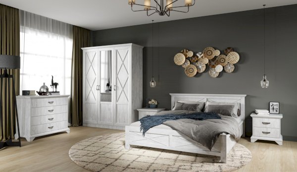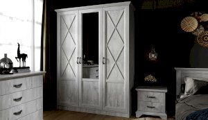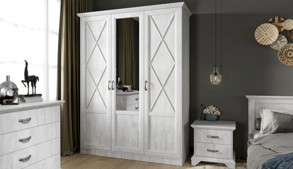 Распашной трехдверный шкаф выполнен в популярном стиле неоклассика – белые рамочные фасады с фактурой и рисунком натурального дерева, декоративные крестообразные накладки, фигурные ножки и карниз все это придает комнате элегантный и светлый вид. Вместительные отделения со штангой и полками поместит в себя верхнюю одежду, коробки с обувью и головные уборы. Мебель выполнена из экологичных материалов.