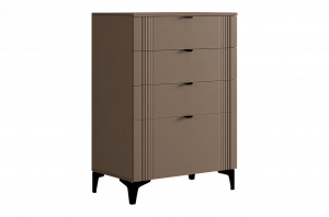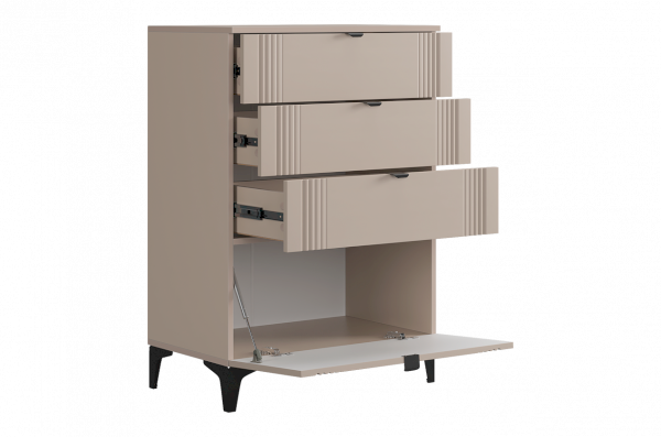 Комод изготовлен из качественных материалов: корпус выполнен из ЛДСП, что гарантирует прочность и долговечность, а фасад, выполненный из МДФ в плёнке ПВХ, не только выглядит эстетично, но и защищает комод от повреждений. Особое внимание заслуживает фрезеровка фасадов, которая придаёт изделию изысканный вид.