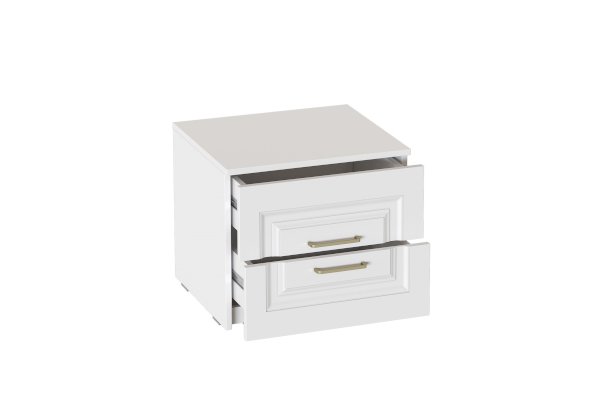 Тумба выполнена в цвете Айс 06 / Белый Аляска. Классическая фрезеровка фасадов и ручки-скобы из брашированного золота придают изделию особый шарм и элегантность. Тумба оснащена двумя ящиками полного выдвижения на шариковых направляющих, которые скользят бесшумно и плавно. Дно и задние стенки выполнены из ХДФ. На опорах размещены войлочные подпятники.